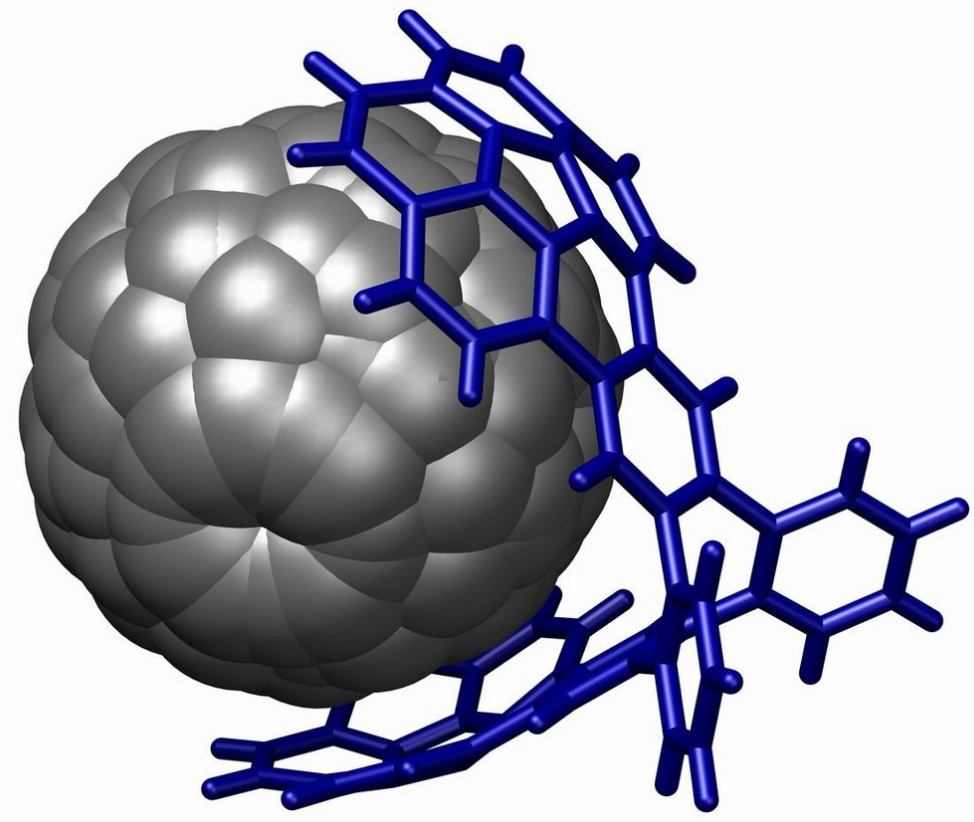 A powerful demonstration of stacking is found in the buckycatcher.[18] This molecular tweezer is based on two concave buckybowls with a perfect fit for one convex fullerene molecule. Complexation takes place simply by evaporating a toluene solution containing both compounds. In solution an association constant of 8600 M−1 is measured based on changes in NMR chemical shifts.