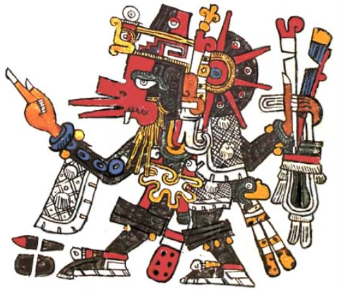 According to another version of the myth, Quetzalcoatl is one of the four sons of Ometecuhtli and Omecihuatl, the four Tezcatlipocas, each of whom presides over one of the four cardinal directions. Over the West presides the White Tezcatlipoca, Quetzalcoatl, the god of light, justice, mercy and wind. Over the South presides the Blue Tezcatlipoca, Huitzilopochtli, the god of war. Over the East presides the Red Tezcatlipoca, Xipe Totec, the god of gold, farming and springtime. And over the North presides the Black Tezcatlipoca, known by no other name than Tezcatlipoca, the god of judgment, night, deceit, sorcery and the Earth.[11] Quetzalcoatl was often considered the god of the morning star, and his twin brother Xolotl was the evening star (Venus). As the morning star, he was known by the title Tlahuizcalpantecuhtli, meaning "lord of the star of the dawn". He was known as the inventor of books and the calendar, the giver of maize (corn) to mankind, and sometimes as a symbol of death and resurrection. Quetzalcoatl was also the patron of the priests and the title of the twin Aztec high priests. Some legends describe him as opposed to human sacrifice[12] while others describe him practicing it.[13][14]