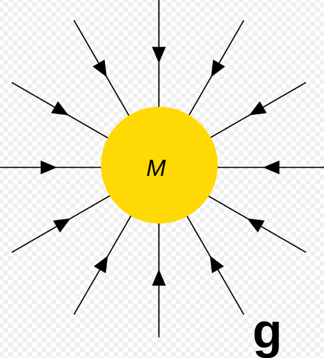 Any body with mass M is associated with a gravitational field g which describes its influence on other bodies with mass. The gravitational field of M at a point r in space corresponds to the ratio between force F that M exerts on a small or negligible test mass m located at r and the test mass itself:[2]