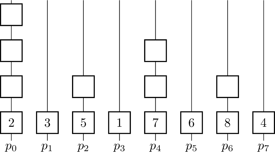 The binary operator for vectors is defined element-wise such that [math]\displaystyle{ \begin{pmatrix} e_i^0 \\ \vdots \\ e_i^{m-1}\end{pmatrix} \oplus^\star \begin{pmatrix} e_j^0 \\ \vdots \\ e_j^{m-1}\end{pmatrix} = \begin{pmatrix} e_i^0 \oplus e_j^0 \\ \vdots \\ e_i^{m-1} \oplus e_j^{m-1} \end{pmatrix} }[/math]. The algorithm further assumes that in the beginning [math]\displaystyle{ x_i = v_i }[/math] for all [math]\displaystyle{ i }[/math] and [math]\displaystyle{ p }[/math] is a power of two and uses the processing units [math]\displaystyle{ p_0, p_1,\dots p_{n-1} }[/math]. In every iteration, half of the processing units become inactive and do not contribute to further computations. The figure shows a visualization of the algorithm using addition as the operator. Vertical lines represent the processing units where the computation of the elements on that line take place. The eight input elements are located on the bottom and every animation step corresponds to one parallel step in the execution of the algorithm. An active processor [math]\displaystyle{ p_i }[/math] evaluates the given operator on the element [math]\displaystyle{ x_i }[/math] it is currently holding and [math]\displaystyle{ x_j }[/math] where [math]\displaystyle{ j }[/math] is the minimal index fulfilling [math]\displaystyle{ j \gt i }[/math], so that [math]\displaystyle{ p_j }[/math] is becoming an inactive processor in the current step. [math]\displaystyle{ x_i }[/math] and [math]\displaystyle{ x_j }[/math] are not necessarily elements of the input set [math]\displaystyle{ X }[/math] as the fields are overwritten and reused for previously evaluated expressions. To coordinate the roles of the processing units in each step without causing additional communication between them, the fact that the processing units are indexed with numbers from [math]\displaystyle{ 0 }[/math] to [math]\displaystyle{ p-1 }[/math] is used. Each processor looks at its [math]\displaystyle{ k }[/math]-th least significant bit and decides whether to get inactive or compute the operator on its own element and the element with the index where the [math]\displaystyle{ k }[/math]-th bit is not set. The underlying communication pattern of the algorithm is a binomial tree, hence the name of the algorithm.