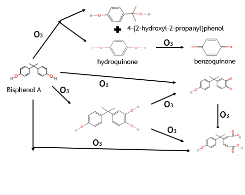 During water treatment, BPA can be removed through ozonation. A 2008 study has identified the degradation products of this reaction, through the use of liquid chromatography and mass spectrometry.[248] The reaction of BPA and ozone is seen below: