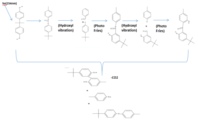 Photodegradation is BPA's main method of natural weathering in the environment, via the Photo Fries rearrangement. Experimentally, BPA has been shown to photodegrade in reactions catalyzed by zinc oxide, titanium dioxide, and tin dioxide, as methods of water decontamination procedures.[97] The Photo Fries degradation is a complex rearrangement of the aromatic carbonate backbone of BPA into phenyl salicylate and dihydroxybenzophenone derivatives before the energized ring releases carbon dioxide. In aqueous solution, BPA shows UV absorption of wavelengths between 250 nm and 360 nm, and the Photo Fries degradation occurs at wavelengths less than 300 nm.[97] The reaction begins by an alpha cleavage between the carbonyl carbon and the oxygen in the carbonate linkage, with the subsequent Photo Fries rearrangement of the products.[247] Seen is the mechanism of the photodegradation of BPA by the Photo Fries reaction: