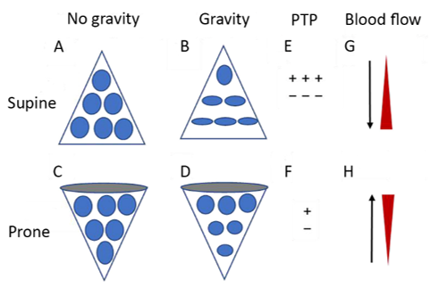 Figure 1. Diagrammatic presentation of physiological mechanisms associated with pronation in the acute respiratory distress syndrome (ARDS). (A) and (C) show the shape of lung units (i.e. alveoli) without the effect of gravity. (B) In the supine position, the volume of dorsal lung units is significantly smaller than the volume of ventral lung units, as a result of gravity and pleural pressure; thus, ventral lung units are more prone to overdistention and dorsal lung units are more prone to compression atelectasis. (D) In the prone position, gravity and pleural pressure result in a decrease in the volume of the ventral lung units and an increase in the volume of the dorsal lung units. (E) In the supine position, the ventral transpulmonary pressure (PTP) may substantially exceed the dorsal PTP. (F) Prone positioning reduces the ventral-to-dorsal PTP gradient, thereby augmenting the homogeneity of ventilation. (G) The reopening, dorsal lung units continue to receive most of the blood flow. (H) The ventral lung units may exhibit a greater tendency to collapse, but are still relatively underperfused. Reproduced in concordance with the Creative Commons Attribution License (CC-BY) from reference 77.