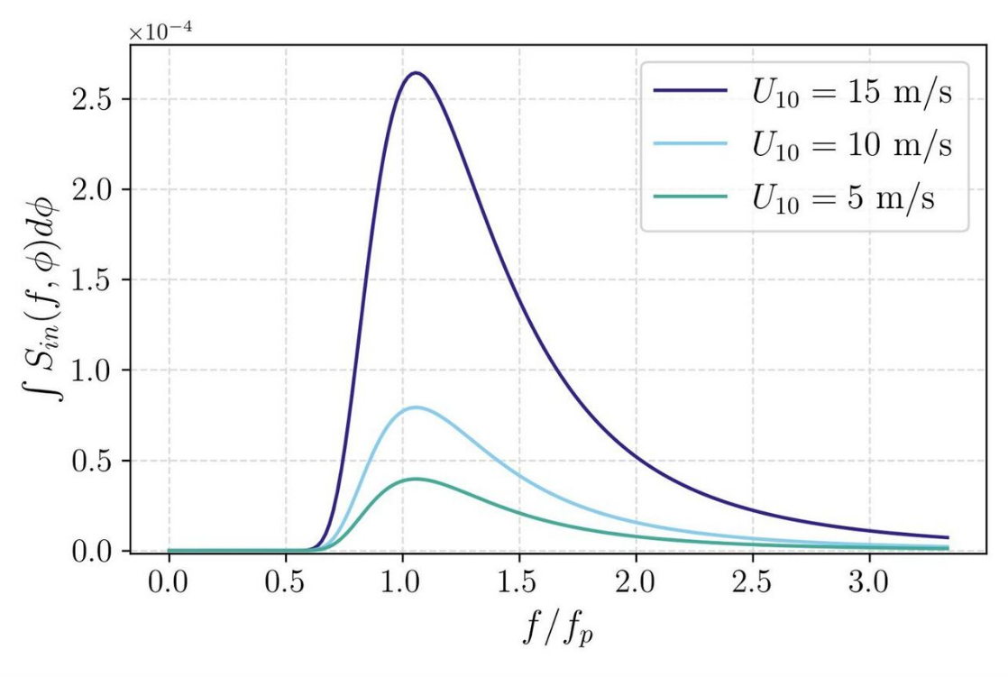 The atmospheric input from the wind to the waves is represented by [math]\displaystyle{ S_{in} }[/math]. For the theory from Miles, Snyder and Cox[6] (1967) were the first to produce a relationship for the experimental growth rate due to atmospheric forcing by use of experimental data. They found [math]\displaystyle{ S_{in}(f,\phi) = (\rho_a/\rho_w) \beta \omega \left(\frac{U_{10}}{C}\cos\phi-1\right)^2 F(f,\phi) }[/math] where [math]\displaystyle{ U_{10} }[/math] the wind speed measured at a height of 10 meters, [math]\displaystyle{ \phi }[/math] the angle between the wind and the waves and [math]\displaystyle{ F(f,\phi) }[/math] a spectrum of the form of the JONSWAP.