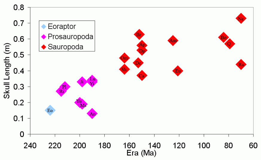 Dinosaurs used in creating these charts are (in date order): Eo Eoraptor; Prosauropods Ri Riojasaurus, Pl Plateosaurus, Yu Yunnanosaurus, Ms Massospondylus, Ji Jingshanosaurus, An Anchisaurus, Lu Lufengosaurus, Yi Yimenosaurus; and Sauropods Sh Shunosaurus, Om Omeisaurus, Mm Mamenchisaurus, Ce Cetiosaurus, Dc Dicraeosaurus, Br Brachiosaurus, Eu Euhelopus, Ap Apatosaurus, Ca Camarasaurus, Dp Diplodocus,[1] Ha Haplocanthosaurus, Am Amargasaurus, Ar Argentinosaurus (approx), Bo Bonitasaura, Q Quaesitosaurus, Al Alamosaurus, Sa Saltasaurus, Ra Rapetosaurus, Op Opisthocoelicaudia, Ne Nemegtosaurus.