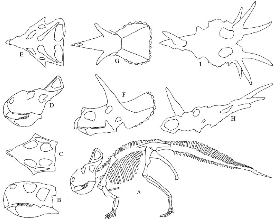 Diversity of ceratopsian skulls. A) Skeleton of Protoceratops. B) to I) Skulls. B) & C) Psittacosaurus side & top. D) & E) Protoceratops side & top. F) & G) Triceratops side & top. H) & I) Styracosaurus side (without lower jaw) & top.