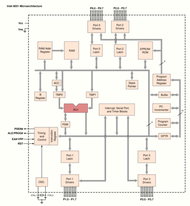 The 8051 architecture provides many functions (central processing unit (CPU), random access memory (RAM), read-only memory (ROM), input/output (I/O) ports, serial port, interrupt control, timers) in one package: