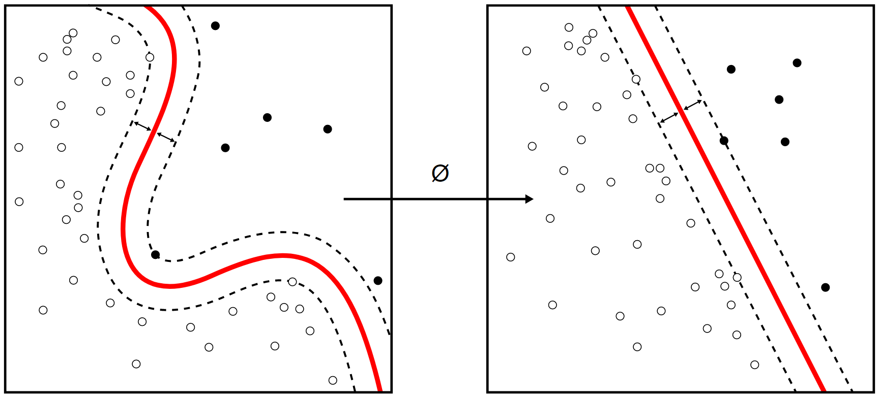 The kernel is related to the transform [math]\displaystyle{ \varphi(\vec{x_i}) }[/math] by the equation [math]\displaystyle{ k(\vec{x_i}, \vec{x_j}) = \varphi(\vec{x_i})\cdot \varphi(\vec{x_j}) }[/math]. The value w is also in the transformed space, with [math]\displaystyle{ \textstyle\vec{w} = \sum_i \alpha_i y_i \varphi(\vec{x}_i) }[/math]. Dot products with w for classification can again be computed by the kernel trick, i.e. [math]\displaystyle{ \textstyle \vec{w} \cdot \varphi(\vec{x}) = \sum_i \alpha_i y_i k(\vec{x}_i, \vec{x}) }[/math].