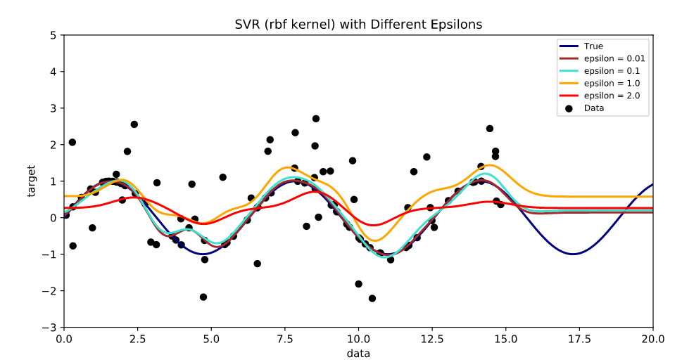where [math]\displaystyle{ x_i }[/math] is a training sample with target value [math]\displaystyle{ y_i }[/math]. The inner product plus intercept [math]\displaystyle{ \langle w, x_i \rangle + b }[/math] is the prediction for that sample, and [math]\displaystyle{ \varepsilon }[/math] is a free parameter that serves as a threshold: all predictions have to be within an [math]\displaystyle{ \varepsilon }[/math] range of the true predictions. Slack variables are usually added into the above to allow for errors and to allow approximation in the case the above problem is infeasible.