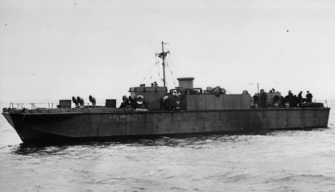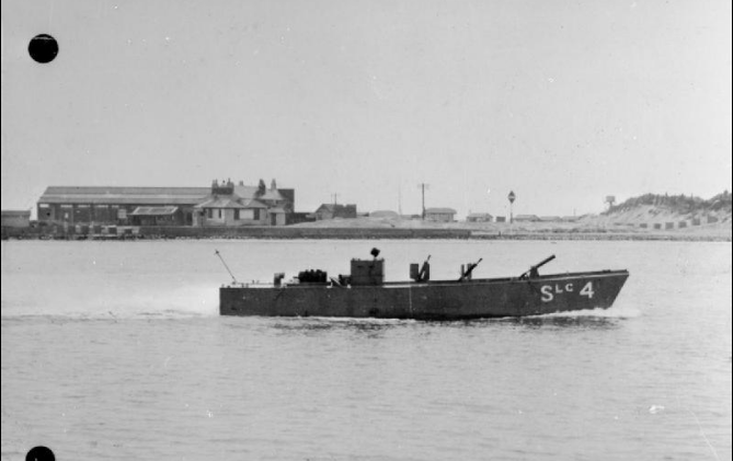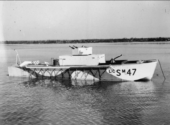 Was used to provide landing support by firing rockets before the beach assault. Landing Craft Support Medium, LCS (M)(3). There was a later improved design with a pointed bow for better speed. Range 90 miles at top speed of 9 knots. A length of 41 feet, a beam, of 10 feet. Displaced 11.4 tons lite and 12.8 tons loaded. A draft of 1 foot 6 inches forward and 2 feet 11 inches aft. Armed with two 50 twin power-operated Vickers M.G., two .303 Lewis guns, one 4-inch smoke mortar. Had twelve Type 18 smoke generators. To protect wood hull had DIHT steel plating on hull sides and deck, bulkheads, and on conning tower and ammunition hoist. Had a crew of 1 officer, 3 men, 6 gun crew. Powered by two Ford V -8 Scripps gasoline engines with 65 hp each. Held 98 gals. of gasoline.