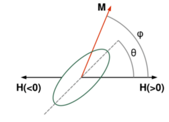 Figure 1. Illustration of the variables used in the Stoner–Wolhfarth model. The dashed line is the easy axis of the particle. https://handwiki.org/wiki/index.php?curid=2041063