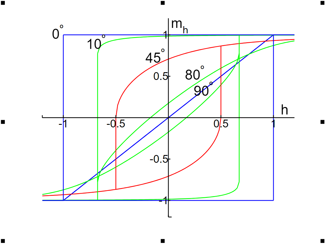 The shape of the hysteresis loop has a strong dependence on the angle between the magnetic field and the easy axis (Figure 3). If the two are parallel (θ = 0), the hysteresis loop is at its biggest (with mh = hs = 1 in normalized units). The magnetization starts parallel to the field and does not rotate until it becomes unstable and jumps to the opposite direction. In general, the larger the angle, the more reversible rotation occurs. At the other extreme of θ = 90°, with the field perpendicular to the easy axis, no jump occurs. The magnetization rotates continuously from one direction to the other (it has two choices of rotation direction, though).