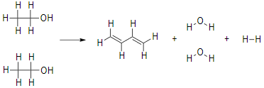 In the single-step process developed by Sergei Lebedev, ethanol is converted to butadiene, hydrogen, and water at 400–450 °C over any of a variety of metal oxide catalysts:[8]