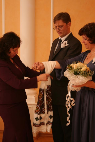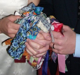 The term has entered the English-speaking mainstream, most likely from neopagan wedding ceremonies during the early 2000s, often erroneously being described as "pre-Christian" by wedding planners.[21] Evidence that the term "handfasting" had been re-interpreted as describing this ceremony specifically is found in the later 2000s, e.g. "handfasting—the blessed marriage rite in which the hands of you and your beloved are wrapped in ribbon as you 'tie the knot.'"[22] By the 2010s, "handfasting ceremonies" were on offer by commercial wedding organizers and had mostly lost their neopagan association (apart from occasional claims that attributes the ceremony to the "ancient Celts").[23] The term "handfasting ribbon" appears from about 2005.[24]