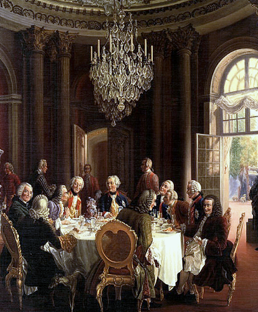 After the death of the Marquise in childbirth in September 1749, Voltaire briefly returned to Paris and in mid-1750 moved to Prussia at the invitation of Frederick the Great.[72] The Prussian king (with the permission of Louis XV) made him a chamberlain in his household, appointed him to the Order of Merit, and gave him a salary of 20,000 French livres a year.[73] He had rooms at Sanssouci and Charlottenburg Palace.[74] Life went well for Voltaire at first,[75] and in 1751 he completed Micromégas, a piece of science fiction involving ambassadors from another planet witnessing the follies of humankind.[76] However, his relationship with Frederick began to deteriorate after he was accused of theft and forgery by a Jewish financier, Abraham Hirschel, who had invested in Saxon government bonds on behalf of Voltaire at a time when Frederick was involved in sensitive diplomatic negotiations with Saxony.[77]
