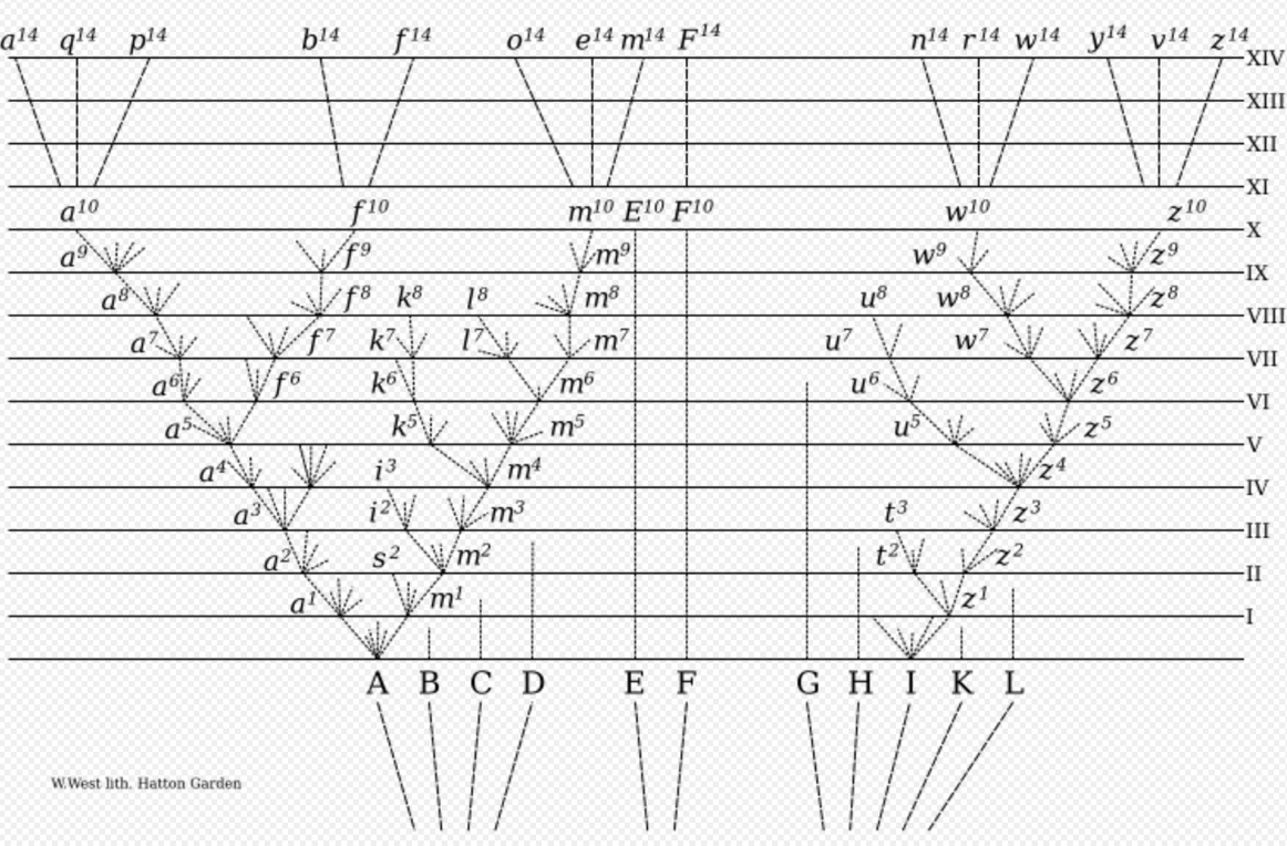 Charles Darwin (1809–1882) used the metaphor of a "tree of life" to conceptualize his theory of evolution. In On the Origin of Species (1859) he presented an abstract diagram of a theoretical tree of life for species of an unnamed large genus (see figure). On the horizontal base line hypothetical species within this genus are labelled A – L and are spaced irregularly to indicate how distinct they are from each other, and are above broken lines at various angles suggesting that they have diverged from one or more common ancestors. On the vertical axis divisions labelled I – XIV each represent a thousand generations. From A, diverging lines show branching descent producing new varieties, some of which become extinct, so that after ten thousand generations descendants of A have become distinct new varieties or even sub-species a10, f10, and m10. Similarly, the descendants of I have diversified to become the new varieties w10 and z10. The process is extrapolated for a further four thousand generations so that the descendants of A and I become fourteen new species labelled a14 to z14. While F has continued for fourteen thousand generations relatively unchanged, species B,C,D,E,G,H,K and L have gone extinct. In Darwin's own words: "Thus the small differences distinguishing varieties of the same species, will steadily tend to increase till they come to equal the greater differences between species of the same genus, or even of distinct genera."[13] This is a branching pattern with no names given to species, unlike the more linear tree Ernst Haeckel made years later (figure below) which includes the names of species and shows a more linear development from "lower" to "higher" species. In his summary to the section, Darwin put his concept in terms of the metaphor of the tree of life: