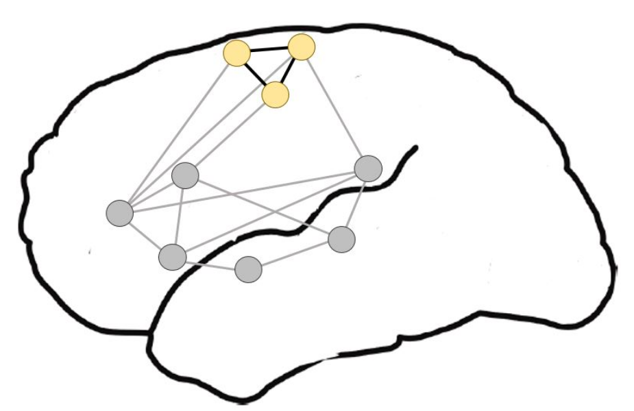 Proposed organization of motor-semantic neural circuits for action language comprehension. Gray dots represent areas of language comprehension, creating a network for comprehending all language. The semantic circuit of the motor system, particularly the motor representation of the legs (yellow dots), is incorporated when leg-related words are comprehended. Adapted from Shebani et al. (2013).