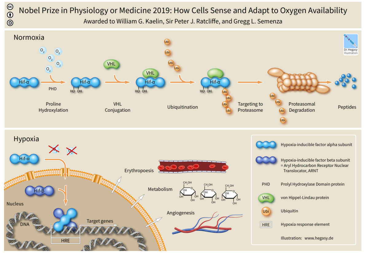 The HIF transcriptional complex was discovered in 1995 by Gregg L. Semenza and postdoctoral fellow Guang Wang.[1][2][3] In 2016, William Kaelin Jr., Peter J. Ratcliffe and Gregg L. Semenza were presented the Lasker Award for their work in elucidating the role of HIF-1 in oxygen sensing and its role in surviving low oxygen conditions.[4] In 2019, the same three individuals were jointly awarded the Nobel Prize in Physiology or Medicine for their work in elucidating how HIF senses and adapts cellular response to oxygen availability.[5]