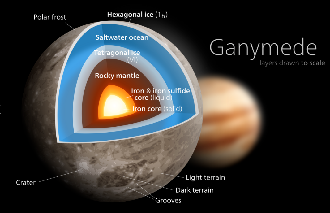 A generic icy moon will consist of a water layer sitting atop a silicate core. For a small satellite like Enceladus, an ocean will sit directly above the silicates and below a solid icy shell, but for a larger ice-rich body like Ganymede, pressures are sufficiently high that the ice at depth will transform to higher pressure phases, effectively forming a "water sandwich" with an ocean located between ice shells.[3] An important difference between these two cases is that for the small satellite the ocean is in direct contact with the silicates, which may provide hydrothermal and chemical energy and nutrients to simple life forms.[3] Because of the varying pressure at depth, models of a water world may include "steam, liquid, superfluid, high-pressure ices, and plasma phases" of water.[28] Some of the solid-phase water could be in the form of ice VII.[29]