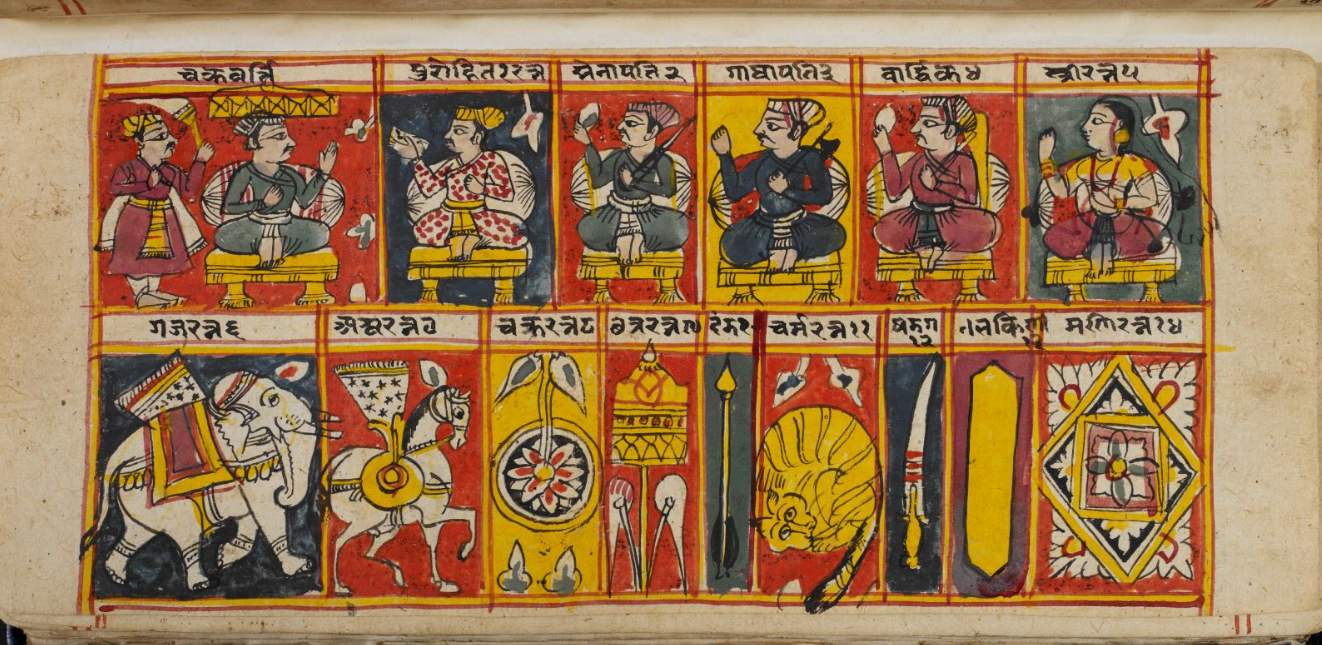 In Jainism, a chakravarti was characterised by possession of saptaratna, or "seven jewels":