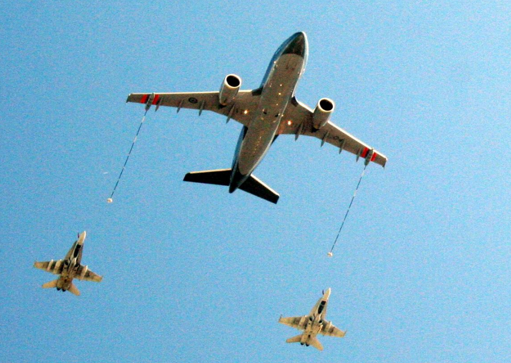 CC-150 Polaris tanker refueling two CF-18 Hornets.