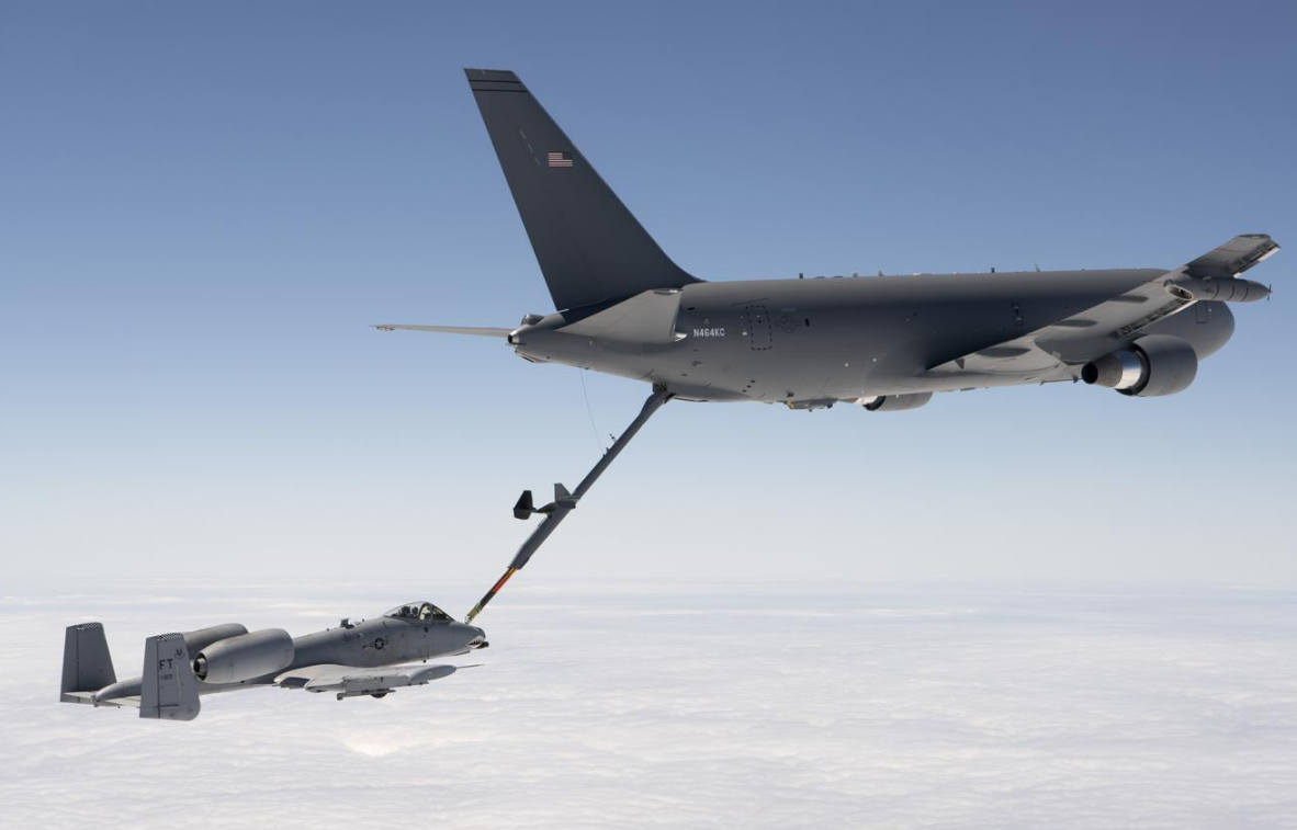 A U.S. Air Force KC-10 Extender refuels a U.S. Navy F/A-18 Hornet.