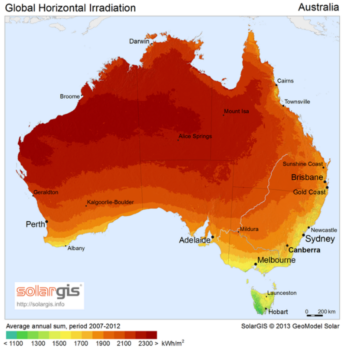 Different measurements of solar irradiance (direct normal irradiance, global horizontal irradiance) are mapped below: