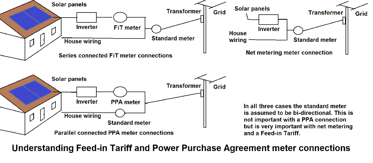In net metering the price of the electricity produced is the same as the price supplied to the consumer, and the consumer is billed on the difference between production and consumption. Net metering can usually be done with no changes to standard electricity meters, which accurately measure power in both directions and automatically report the difference, and because it allows homeowners and businesses to generate electricity at a different time from consumption, effectively using the grid as a giant storage battery. With net metering, deficits are billed each month while surpluses are rolled over to the following month. Best practices call for perpetual roll over of kWh credits.[66] Excess credits upon termination of service are either lost or paid for at a rate ranging from wholesale to retail rate or above, as can be excess annual credits.[67]
