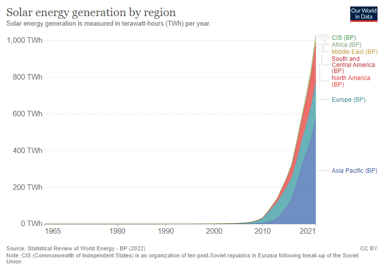 So solar is (or is predicted to become) the cheapest source of energy in all of Central America, Africa, the Middle East, India, South-east Asia, Australia, and several other places.[60](p8)