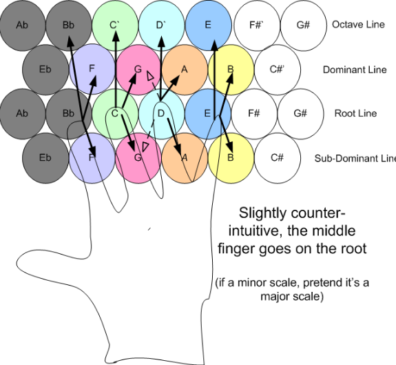Of the large number of isomorphic note assignments possible, the Thummer's Wicki-Hayden format was chosen since all notes of the major and minor scales fall under the fingers and the relative simplicity of relating it to conventional music notation.