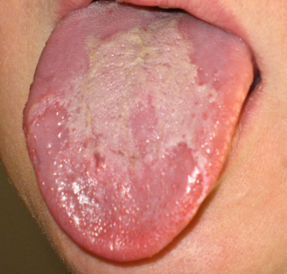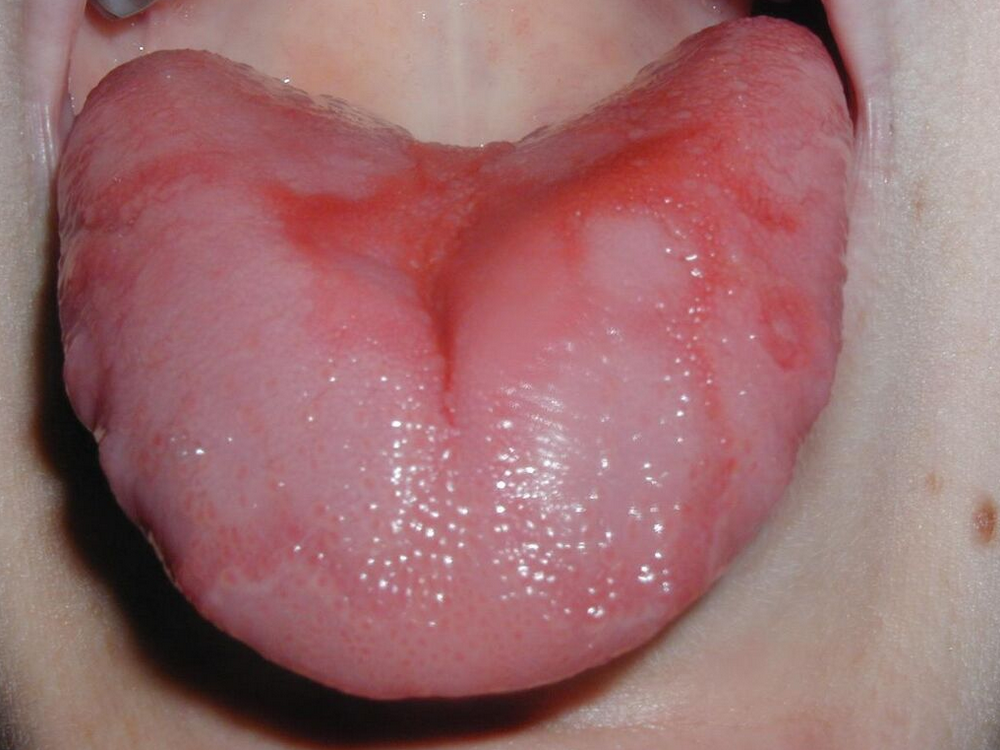 There are usually no symptoms other than the unusual appearance of the tongue, but in some cases persons may experience pain or burning, e.g. when eating hot, acidic, spicy or other kinds of foods (e.g. cheese, tomatoes, fruit).[3][4] Where there is a burning symptom, other causes of a burning sensation on the tongue are considered, such as oral candidiasis.[5]