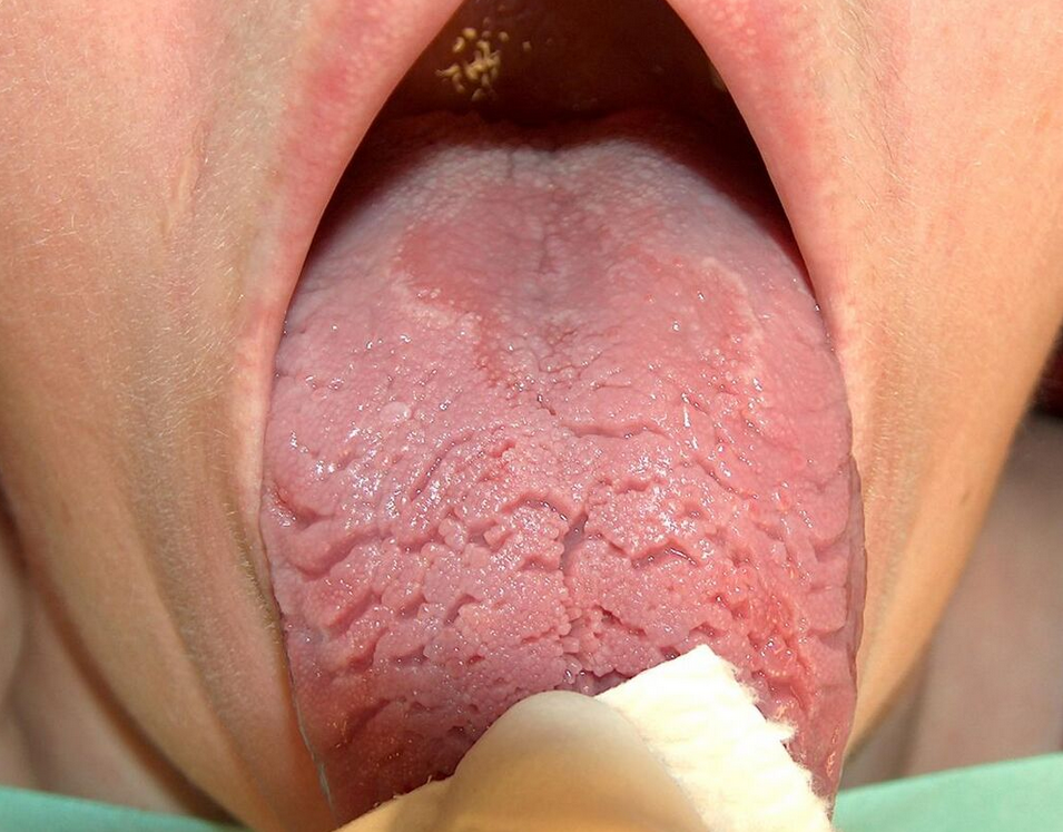 The cause is unknown.[4][6][7] Geographic tongue does not usually cause any symptoms, and in those cases where there are symptoms, an oral parafunctional habit may be a contributory factor.[2] Persons with parafunctional habits related to the tongue may show scalloping on the sides of the tongue (crenated tongue). Some suggest that hormonal factors may be involved,[8] because one reported case in a female appeared to vary in severity in correlation with oral contraceptive use.[1] People with geographic tongue frequently claim that their condition worsens during periods of psychologic stress.[2] Geographic tongue is inversely associated with smoking and tobacco use.[6] Sometimes geographic tongue is said to run in families,[8] and it is reported to be associated with several different genes, though studies show family association may also be caused by similar diets. Some have reported links with various human leukocyte antigens, such as increased incidence of HLA-DR5, HLA-DRW6 and HLA-Cw6 and decreased incidence in HLA-B51.[3] Vitamin B2 deficiency (ariboflavinosis) can cause several signs in the mouth, possibly including geographic tongue,[9] although other sources state that geographic tongue is not related to nutritional deficiency.[8] Fissured tongue often occurs simultaneously with geographic tongue,[4] and some consider fissured tongue to be an end stage of geographic tongue.[2]
