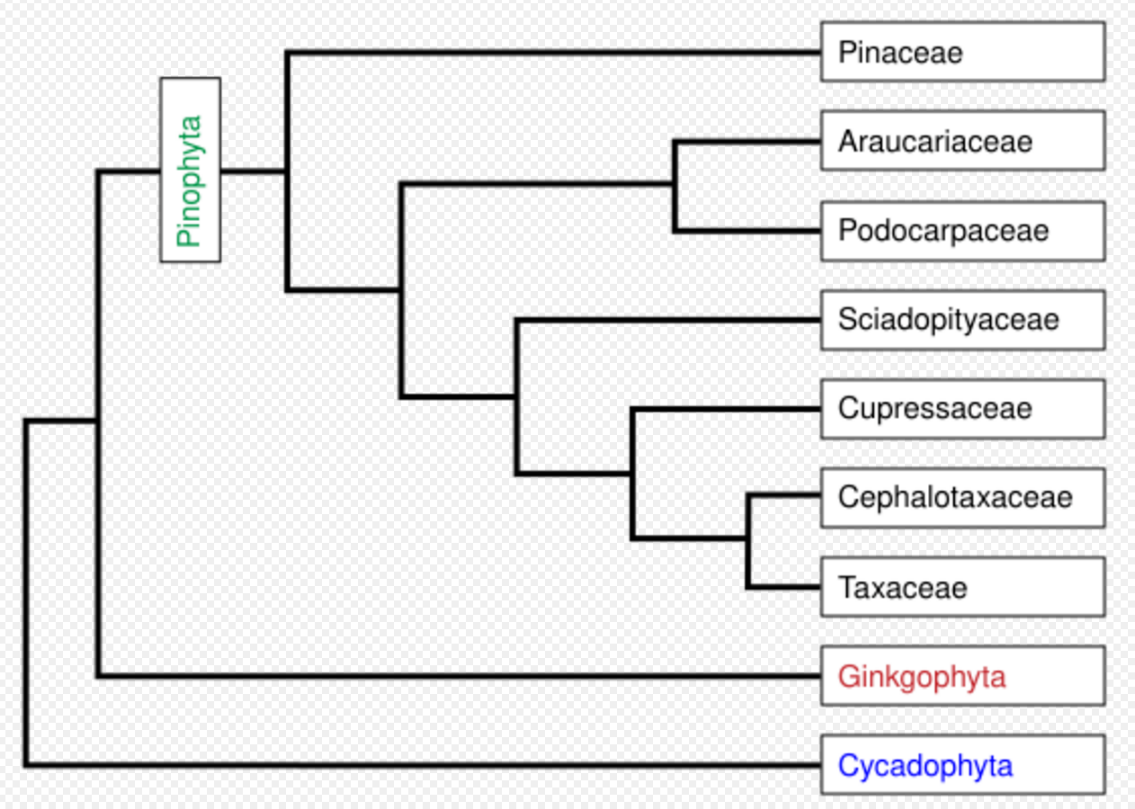 The conifers are now accepted as comprising seven families,[4] with a total of 65–70 genera and 600–630 species (696 accepted names). The seven most distinct families are linked in the box above right and phylogenetic diagram left. In other interpretations, the Cephalotaxaceae may be better included within the Taxaceae, and some authors additionally recognize Phyllocladaceae as distinct from Podocarpaceae (in which it is included here). The family Taxodiaceae is here included in family Cupressaceae, but was widely recognized in the past and can still be found in many field guides. A new classification and linear sequence based on molecular data can be found in an article by Christenhusz et al.[5]