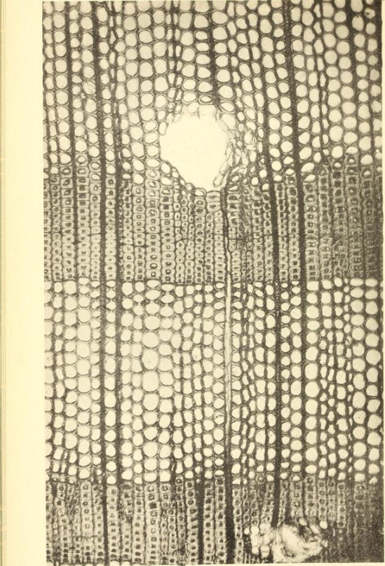 Tree rings are records of the influence of environmental conditions, their anatomical characteristics record growth rate changes produced by these changing conditions. The microscopic structure of conifer wood consists of two types of cells: parenchyma, which have an oval or polyhedral shape with approximately identical dimensions in three directions, and strongly elongated tracheids. Tracheids make up more than 90% of timber volume. The tracheids of earlywood formed at the beginning of a growing season have large radial sizes and smaller, thinner cell walls. Then, the first tracheids of the transition zone are formed, where the radial size of cells and thickness of their cell walls changes considerably. Finally, the latewood tracheids are formed, with small radial sizes and greater cell wall thickness. This is the basic pattern of the internal cel structure of conifer tree rings.[11]