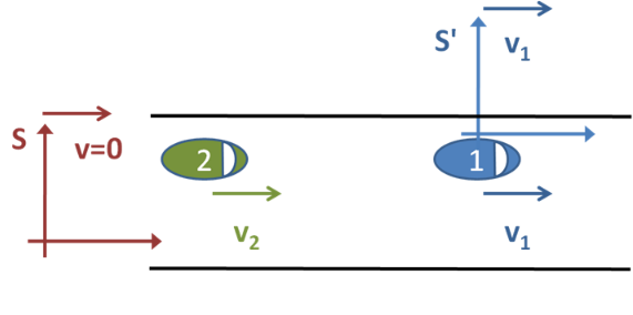Alternatively, we could choose a frame of reference S′ situated in the first car. In this case, the first car is stationary and the second car is approaching from behind at a speed of v2 − v1 = 8 m/s. In order to catch up to the first car, it will take a time of d/v2 − v1 = 200/8 s, that is, 25 seconds, as before. Note how much easier the problem becomes by choosing a suitable frame of reference. The third possible frame of reference would be attached to the second car. That example resembles the case just discussed, except the second car is stationary and the first car moves backward towards it at 8 m/s.