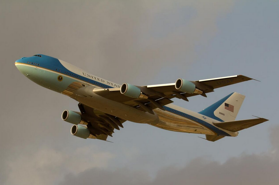 Air transports of heads of state and government are often painted in unique color schemes. The US President's aircraft, Air Force One , uses a light-blue and sky-blue color scheme, with the Seal of the President of the United States just above the front gear and the flag of the United States on the tailfin. The livery was designed by French-American industrial designer Raymond Loewy at the instigation, and with the help of, then-First Lady Jacqueline Kennedy.[7]