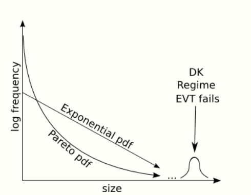Provided that the statistical properties of the system are consistent over time (stationary), frequency and severity statistics may be constructed based on past observations, simulations, and/or assumptions. If not, one may only construct scenarios. However, in any case, given the uncertainty present, a range of scenarios should be considered. Due to the shortage of data for extreme events, the principle of parsimony, and theoretical results from extreme value theory about universal tail models, one typically relies on a GPD tail model. However such a model excludes DK. Thus, when one has sufficient reason to believe that DK are present, or if one simply wants to consider a scenario, one may e.g., consider a density mixture of a GPD and a density for the DK regime.