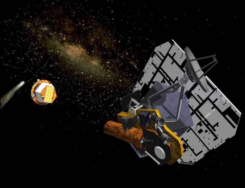Stardust is a 300-kilogram robotic space probe launched by NASA on February 7, 1999 to study the asteroid 5535 Annefrank and collect samples from the coma of comet Wild 2. The primary mission was completed January 15, 2006, when the sample return capsule returned to Earth.[50] Stardust intercepted comet Tempel 1 on February 15, 2011, a small Solar System body previously visited by Deep Impact on July 4, 2005. Stardust was decommissioned on March 25, 2011.[51] It is the first sample return mission to collect cosmic dust.