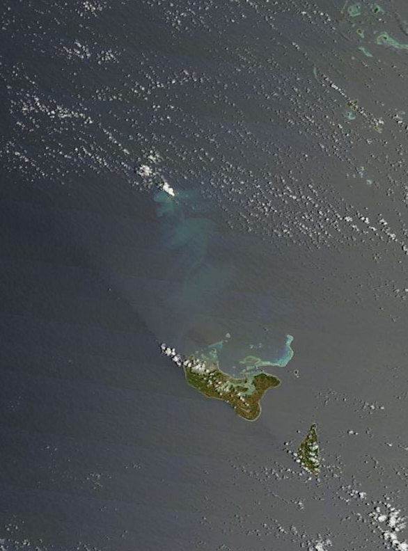 A new eruption began at Hunga Tonga-Hunga Haʻapai on December 19, 2014. Local fishermen reported a tall white steam plume rising from the ocean over the undersea volcanic mount. Satellite images taken on December 29 showed the eruption continuing, with a smoke and ash plume rising from the site, and discolored seawater (possibly caused by smoke and ash released below the surface, or by disturbance of the seabed).[17] The eruption continued into 2015, with a tall ash cloud rising 3 kilometres (9,800 ft) into the sky on January 6, 2015.[18]