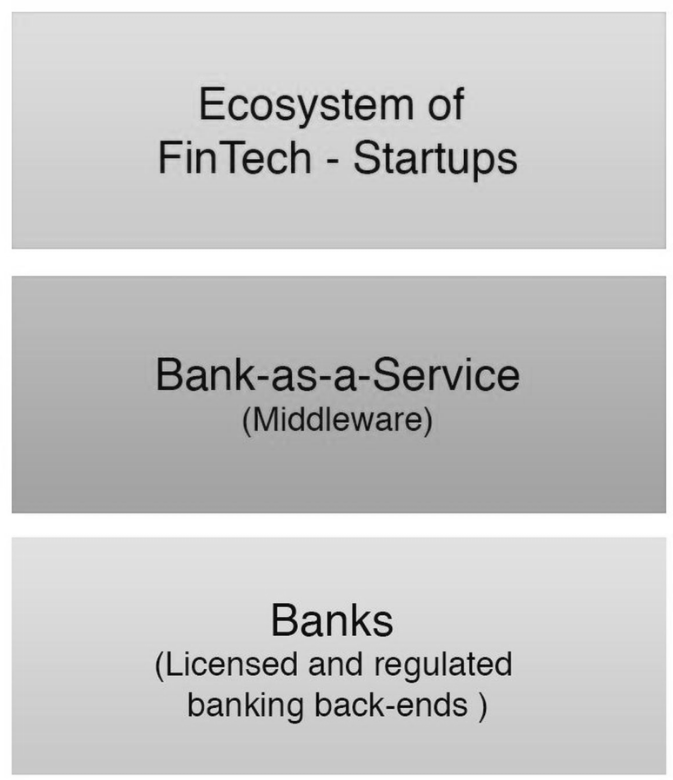 Chris Skinner suggested a 3-layer representation of the BaaS stack. In this stack, the underlying infrastructure-as-a-service is provided by a traditional, licensed and regulated bank. Above this bank would be the centralized Middleware layer that Skinner refers to as “Bank as a Service.” Added on to the Bank-as-a-Service is a group of decomposed banking services consisting of an ecosystem of FinTech startups and service providers. With this technology, based on the BaaS-platform, it is possible to create FinTech banks, which could improve banking processes and provide increased convenience for banking clients. In such a constellation, FinTech banks are enabled to compete directly with banks by offering core-banking services without having to build all the products that would be needed. The API-based Bank as a Service platform serves as the back-end that hosts standalone independent FinTech startups and integrates seamlessly with any existing back-office of traditional banks. This allows non-banks to easily and cost-effectively launch additional financial products and expand into additional markets.[2]