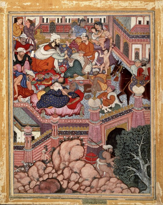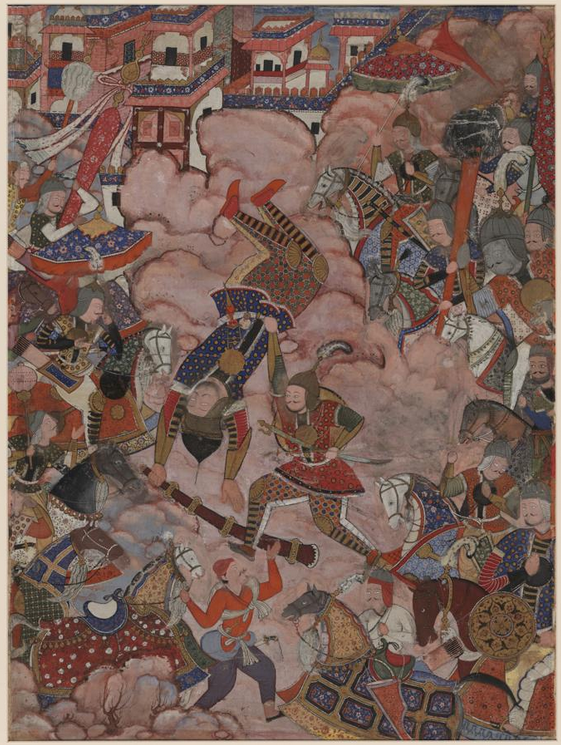 In 1555, Babur noted with disapproval that the leading literary figure of Khurasan had recently “wasted his time” in composing an imitation of the cycle.[7] The great emperor Akbar (1556-1605), far from sharing his grandfather's attitude, conceived and supervised the immense task of illustrating the whole romance. As Akbar's court chronicler tells us, Hamza's adventures were “represented in twelve volumes, and clever painters made the most astonishing illustrations for no less than one thousand and four hundred passages of the story.”[8] The illustrated manuscript thus created became the supreme achievement of Mughal art: “of all the loot carried off from Delhi by Nadir Shah in 1739 (including the Peacock Throne), it was only the Hamza-nama, ‘painted with images that defy the imagination,’ that Emperor Muhammad Shah pleaded to have returned.”[9]