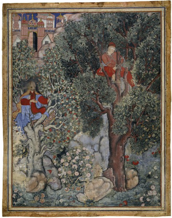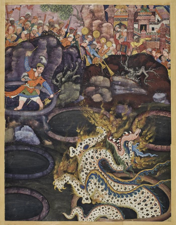 Dastan and qissa in Persian both mean “story,” and the narrative genre they refer to goes back to medieval Iran. William L. Hanaway,[1] who has made a close study of Persian dastans, describes them as “popular romances” that were “created, elaborated, and transmitted” by professional storytellers. At least as early as the ninth century, it was a widely popular form of story-telling. Dastan-narrators told tales of heroic romance and adventure- stories about gallant princes and their encounters with evil kings, enemy champions, demons, magicians, jinns, divine emissaries, tricky secret agents called ayyars, and beautiful princesses who might be human or of the Pari (“fairy”) race. Their ultimate subject matter was always simple: “razm o bazm,” the battlefield and the elegant courtly life, war and love. Hanaway mentions five principal dastans surviving from the pre-Safavid (i.e., fifteenth century and earlier) period: those that grew up around the adventures of the world-conqueror Alexander, the great Persian king Darius, the Prophet Muhammad’s uncle Hamza, the legendary king Firoz Shah, and a trickster-hero named Samak the Ayyar. Of all the early dastans, the Hamza romance is thought to be the oldest.