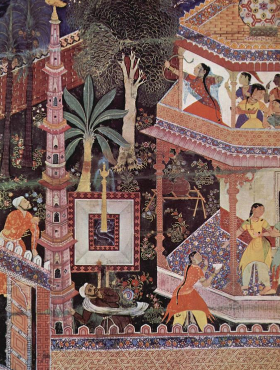 Annemarie Schimmel judges that the Hamza story “must have been popular in the Indian subcontinent from the days of Mahmud of Ghazni[5] in the early eleventh century. The earliest solid evidence, however, seems to be a late-fifteenth-century set of paintings that illustrate the story; these were crudely executed, possibly in Jaunpur, perhaps for a not-too-affluent patron.[6]