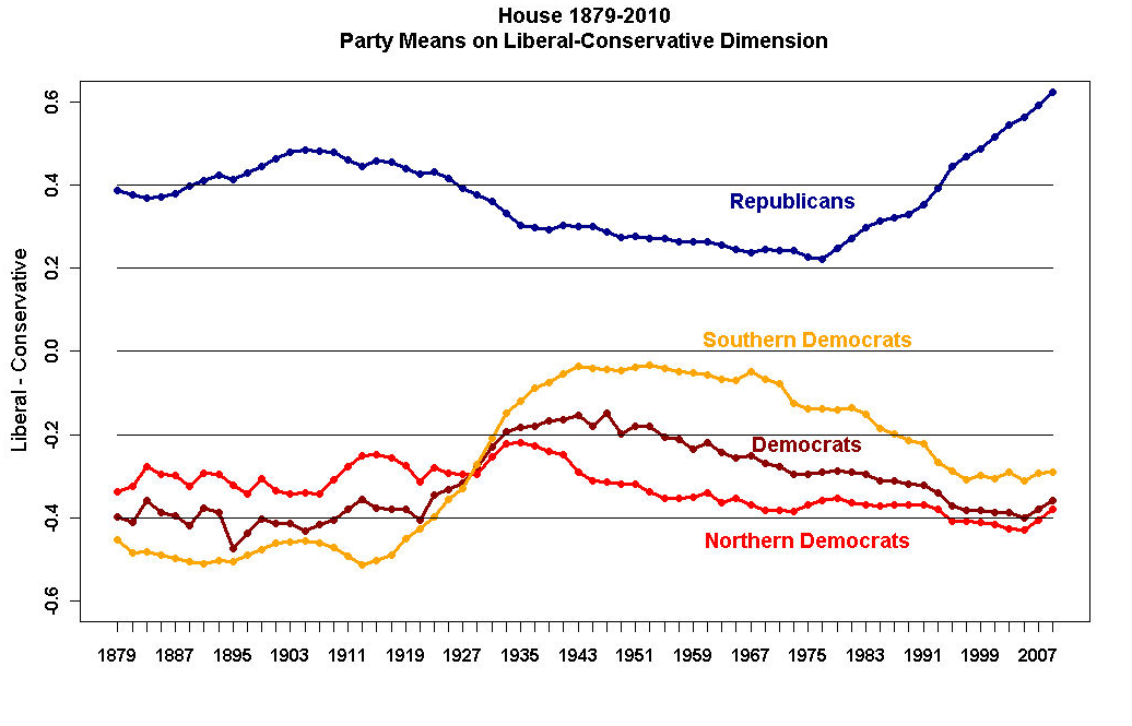 Some scholars argue that diverging parties has been one of the major driving forces of polarization as policy platforms have become more distant. This theory is based on recent trends in the United States Congress, where the majority party prioritizes the positions that are most aligned with its party platform and political ideology.[15] The adoption of more ideologically distinct positions by political parties can cause polarization among both elites and the electorate. For example, after the passage of the Voting Rights Act, the number of conservative Democrats in Congress decreased, while the number of conservative Republicans increased. Within the electorate during the 1970s, Southern Democrats shifted toward the Republican Party, showing polarization among both the elites and the electorate of both main parties.[10][16][17]