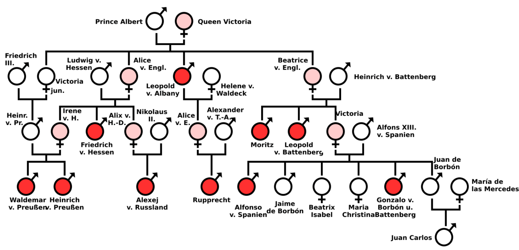 In Spain, Queen Victoria's youngest daughter, Princess Beatrice, had a daughter Victoria Eugenie of Battenberg, who later became Queen of Spain. Two of her sons were haemophiliacs and both died from minor car accidents. Her eldest son, Prince Alfonso of Spain, Prince of Asturias, died at the age of 31 from internal bleeding after his car hit a telephone booth.[53] Her youngest son, Infante Gonzalo, died at age 19 from abdominal bleeding following a minor car accident in which he and his sister hit a wall while avoiding a cyclist. Neither appeared injured or sought immediate medical care and Gonzalo died two days later from internal bleeding.[54]