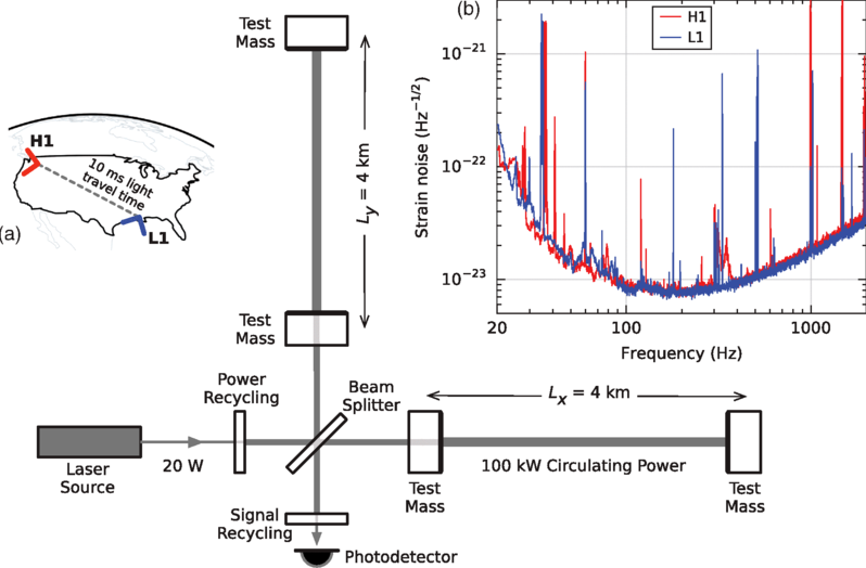 The parameters in this section refer to the Advanced LIGO experiment. The primary interferometer consists of two beam lines of 4 km length which form a power-recycled Michelson interferometer with Gires–Tournois etalon arms. A pre-stabilized 1064 nm Nd emits a beam with a power of 20 W that passes through a power recycling mirror. The mirror fully transmits light incident from the laser and reflects light from the other side increasing the power of the light field between the mirror and the subsequent beam splitter to 700 W. From the beam splitter the light travels along two orthogonal arms. By the use of partially reflecting mirrors, Fabry–Pérot cavities are created in both arms that increase the effective path length of laser light in the arm. The power of the light field in the cavity is 100 kW.[45]