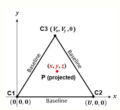 The simplest algorithm corresponds to the sphere centers in Fig. 2. The figure 'page' is the plane containing C1, C2 and C3. If P is a 'point of interest' (e.g., vehicle) at [math]\displaystyle{ (x,y,z) }[/math], then Pythagoras's theorem yields the slant ranges between P and the sphere centers: