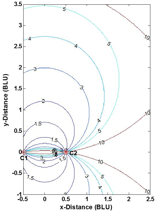 The position accuracy of a true range multilateration system—e.g., accuracy of the [math]\displaystyle{ (x,y) }[/math] coordinates of point P in Fig. 1 -- depends upon two factors: (1) the range measurement accuracy, and (2) the geometric relationship of P to the system's stations C1 and C2. This can be understood from Fig. 4. The two stations are shown as dots, and BLU denotes baseline units. (The measurement pattern is symmetric about both the baseline and the perpendicular bisector of the baseline, and is truncated in the figure.) As is commonly done, individual range measurement errors are taken to be independent of range, statistically independent and identically distributed. This reasonable assumption separates the effects of user-station geometry and range measurement errors on the error in the calculated [math]\displaystyle{ (x,y) }[/math] coordinates of P. Here, the measurement geometry is simply the angle at which two circles cross—or equivalently, the angle between lines P-C1 and P-C2. When point P- is not on a circle, the error in its position is approximately proportional to the area bounded by the nearest two blue and nearest two magenta circles.