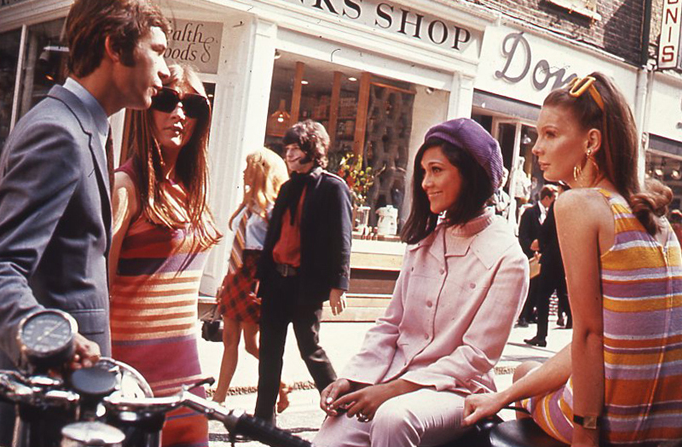 The "Generation Gap", or the inevitable perceived divide in worldview between the old and young, was perhaps never greater than during the counterculture era.[37] A large measure of the generational chasm of the 1960s and early 1970s was born of rapidly evolving fashion and hairstyle trends that were readily adopted by the young, but often misunderstood and ridiculed by the old. These included the wearing of very long hair by men,[38] the wearing of natural or "Afro" hairstyles by black people, the donning of revealing clothing by women in public, and the mainstreaming of the psychedelic clothing and regalia of the short-lived hippie culture. Ultimately, practical and comfortable casual apparel, namely updated forms of T-shirts (often tie-dyed, or emblazoned with political or advertising statements), and Levi Strauss-branded blue denim jeans[39] became the enduring uniform of the generation. The fashion dominance of the counterculture effectively ended with the rise of the Disco and Punk Rock eras in the later 1970s, even as the global popularity of T-shirts, denim jeans, and casual clothing in general have continued to grow.