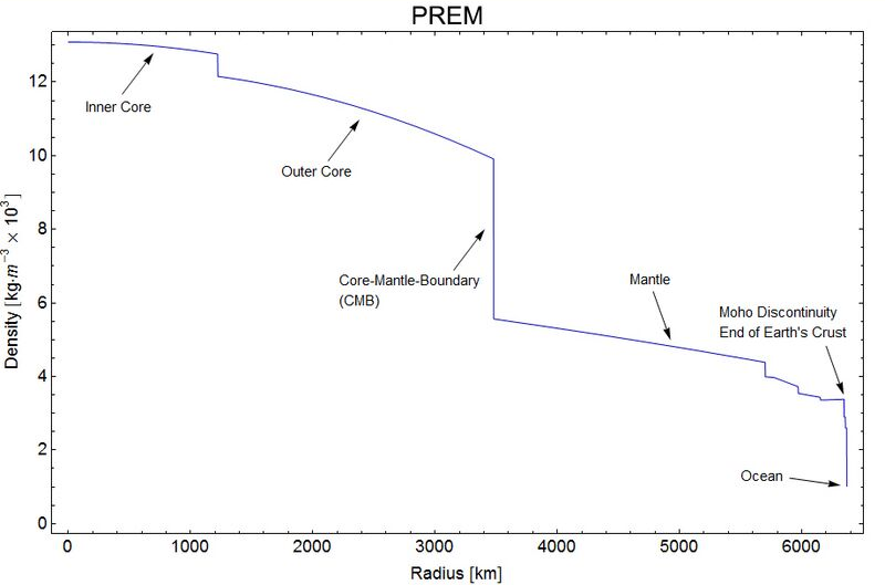 The average density of Earth is 5.515 g/cm3.[16] Because the average density of surface material is only around 3.0 g/cm3, we must conclude that denser materials exist within Earth's core. This result has been known since the Schiehallion experiment, performed in the 1770s. Charles Hutton in his 1778 report concluded that the mean density of the Earth must be about [math]\displaystyle{ \tfrac{9}{5} }[/math] that of surface rock, concluding that the interior of the Earth must be metallic. Hutton estimated this metallic portion to occupy some 65% of the diameter of the Earth.[17] Hutton's estimate on the mean density of the Earth was still about 20% too low, at 4.5 g/cm3. Henry Cavendish in his torsion balance experiment of 1798 found a value of 5.45 g/cm3, within 1% of the modern value.[18] Seismic measurements show that the core is divided into two parts, a "solid" inner core with a radius of ≈1,220 km[19] and a liquid outer core extending beyond it to a radius of ≈3,400 km. The densities are between 9,900 and 12,200 kg/m3 in the outer core and 12,600–13,000 kg/m3 in the inner core.[20]